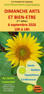 Dimanche Arts et Bien Être le 6 septembre 2026 : Bienvenue aux artistes, aux accompagnants en Bien Être en tant qu’exposants et aux sponsors : prenez contact par mail ou téléphone.